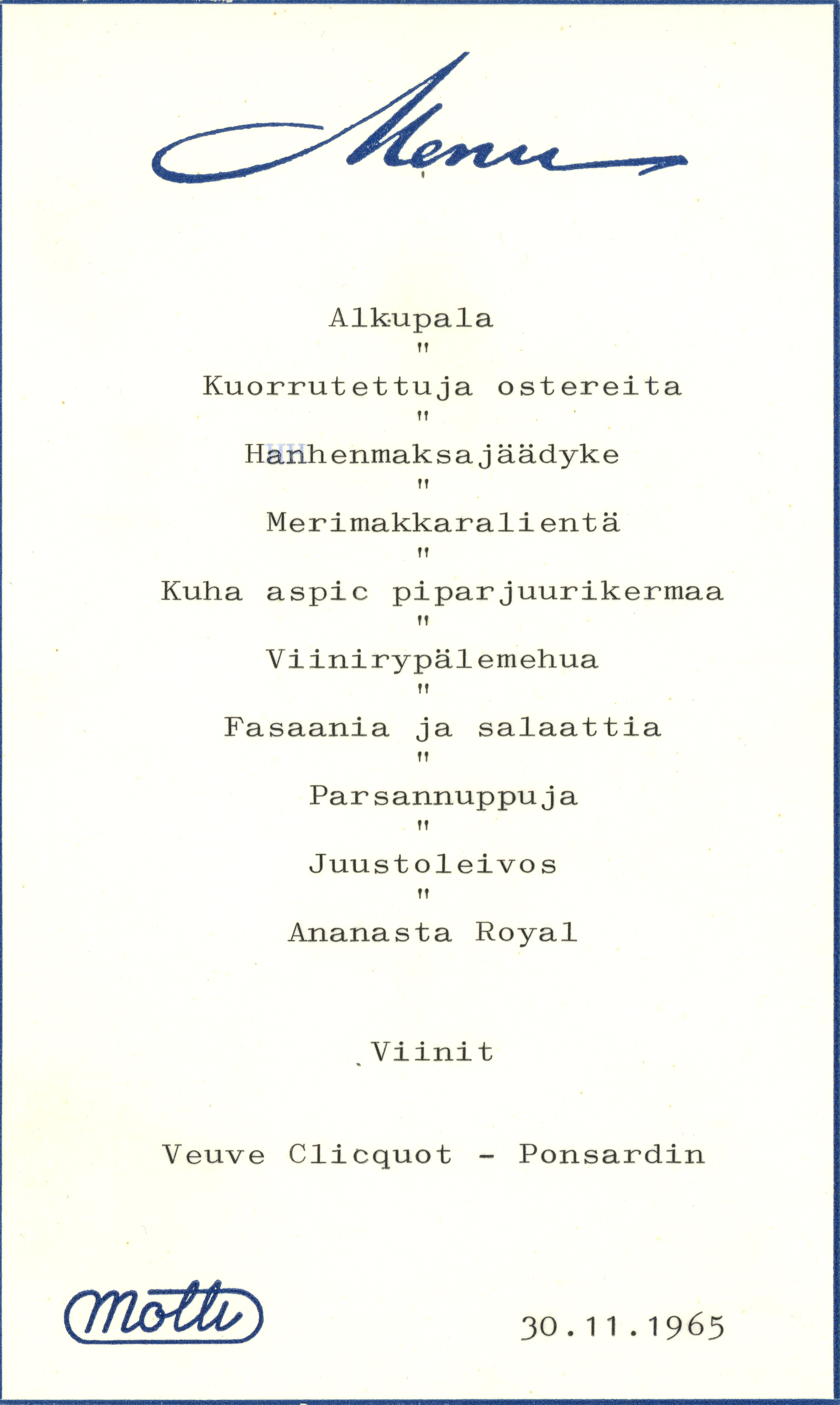 Motin Uutiset 1/1960 oli Lapin erikoisnumero, joka esitteli ravintolan asiakaskunnalle 6 lapinriistalounasta ja 6 lapinriistapäivällistä. Lounaslistoilla oli poronkäristystä, poron pippuripihviä, paistettua poronmaksaa ja sivusilavaa, savuporonpaistia ja korvasienimunakokkelia sekä keitettyä poronkieltä madeira-herkkusienikastikkeen kera. Päivällisvaihtoehtojen pääruokia olivat palava poronlihavarras, korvasienillä kuorrutettu poronsatula ja poronpaistikkeita madeira-pikkelsikastikkeessa. Moni näistä ruokalajeista hyväksyttiin myös Urho Kekkosen kauden edustustilaisuuksiin.