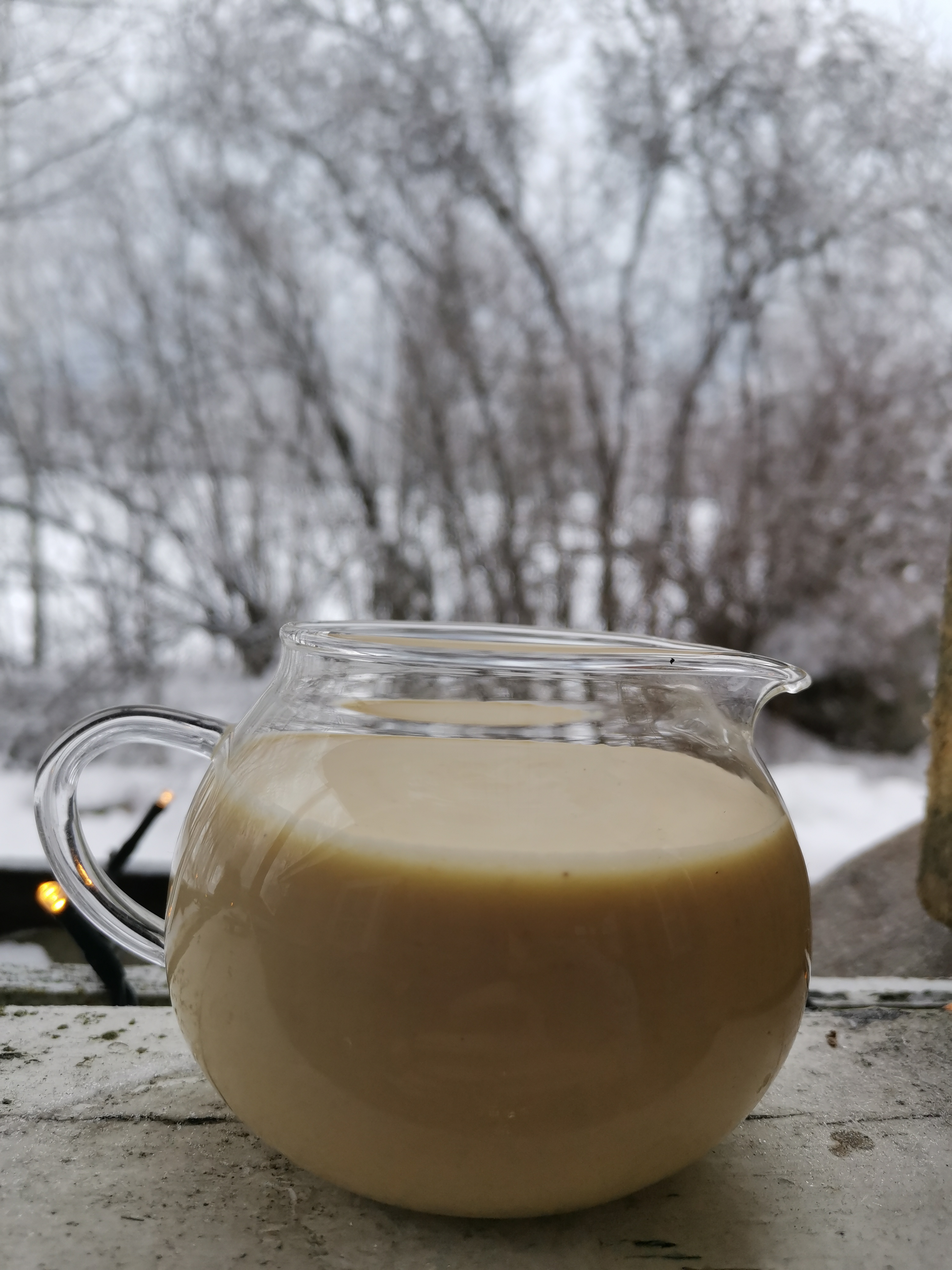 Kattilassa pitäisi nyt olla aika paksua kiisseliä muistuttavaa kullankeltaisia kastiketta, ja sen voi laittaa jääkaappiin tarjoilua odottamaan. Tarjoiltaessa sekoita kulhossa saman verran kirpeäkastiketta ja kermaa.