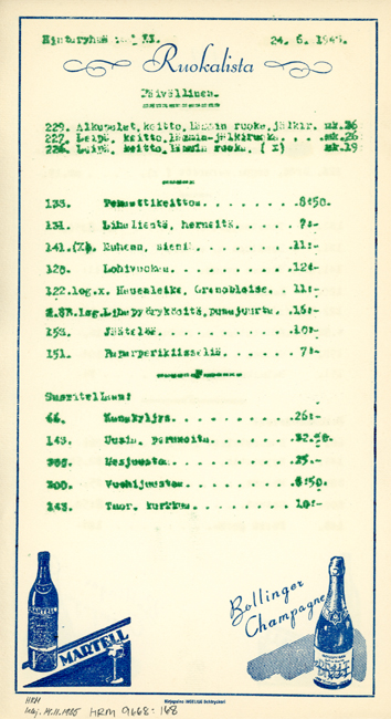 Ravintola Eliten ruokalista 24.6.1943. Kiisseli (nro 151) on tehty satokauden mukaisesti raparperistä. Hotelli- ja ravintolamuseon kokoelmat.
