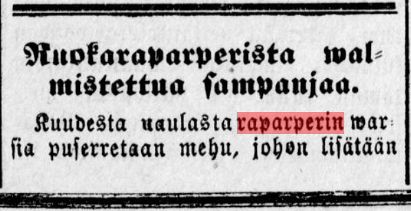 ”Ruokaraparperista valmistettua sampanjaa” otsikolla jaettiin raparperiohje Tampereen Sanomissa vuonna 1887. Lähde: Tampereen Sanomat, 14.3.1887, nro 31, s. 3.