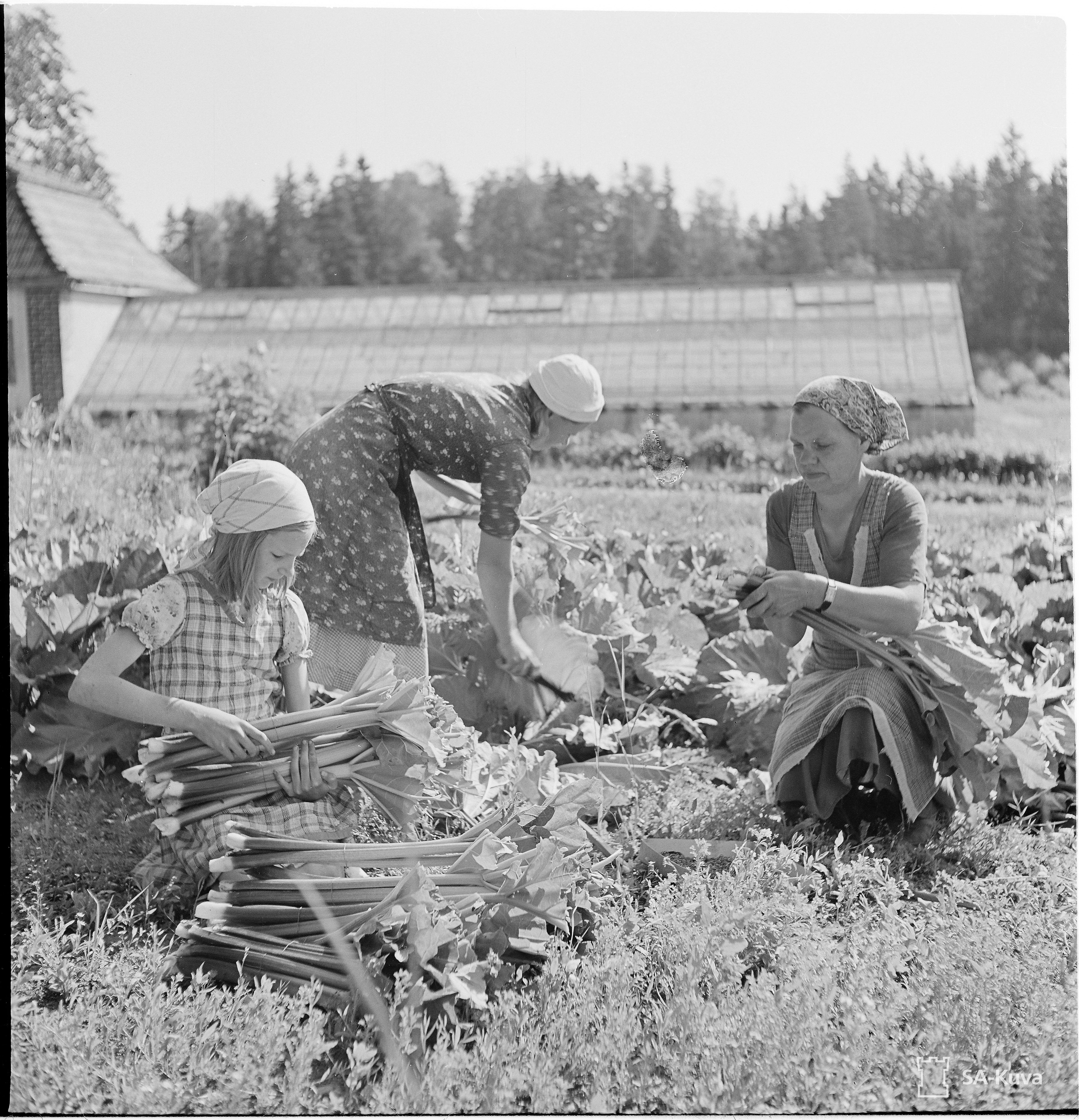 Kolme henkilöä poimimassa raparperisatoa kasvimaalta. Taustalla kasvihuone. Kuvaaja: Soldan. Sotamuseo. Lähde: finna.fi