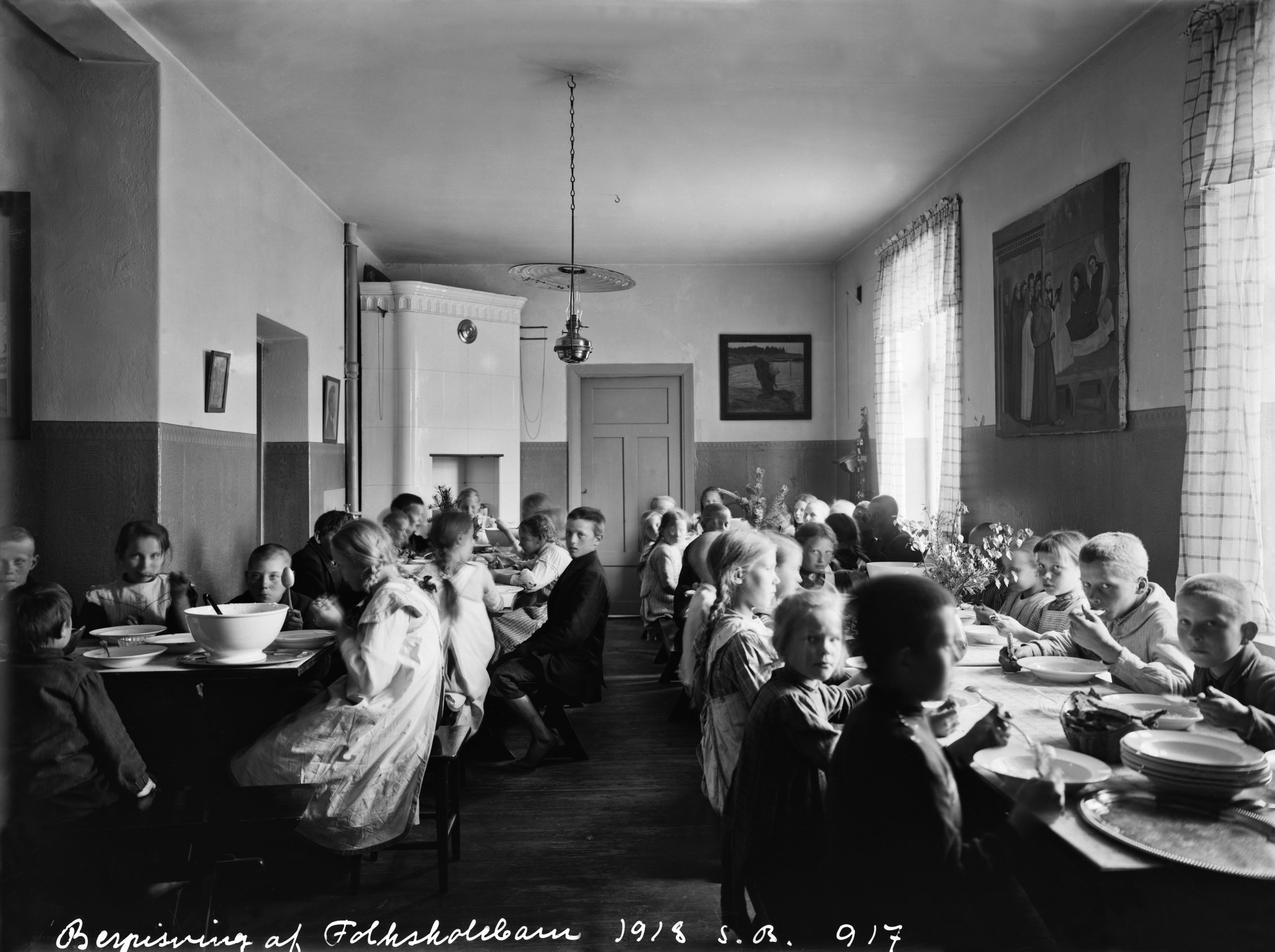 1913 . Vallilan kansakoulu, Hämeentie 80. Kouluruokailua ruokasalissa.