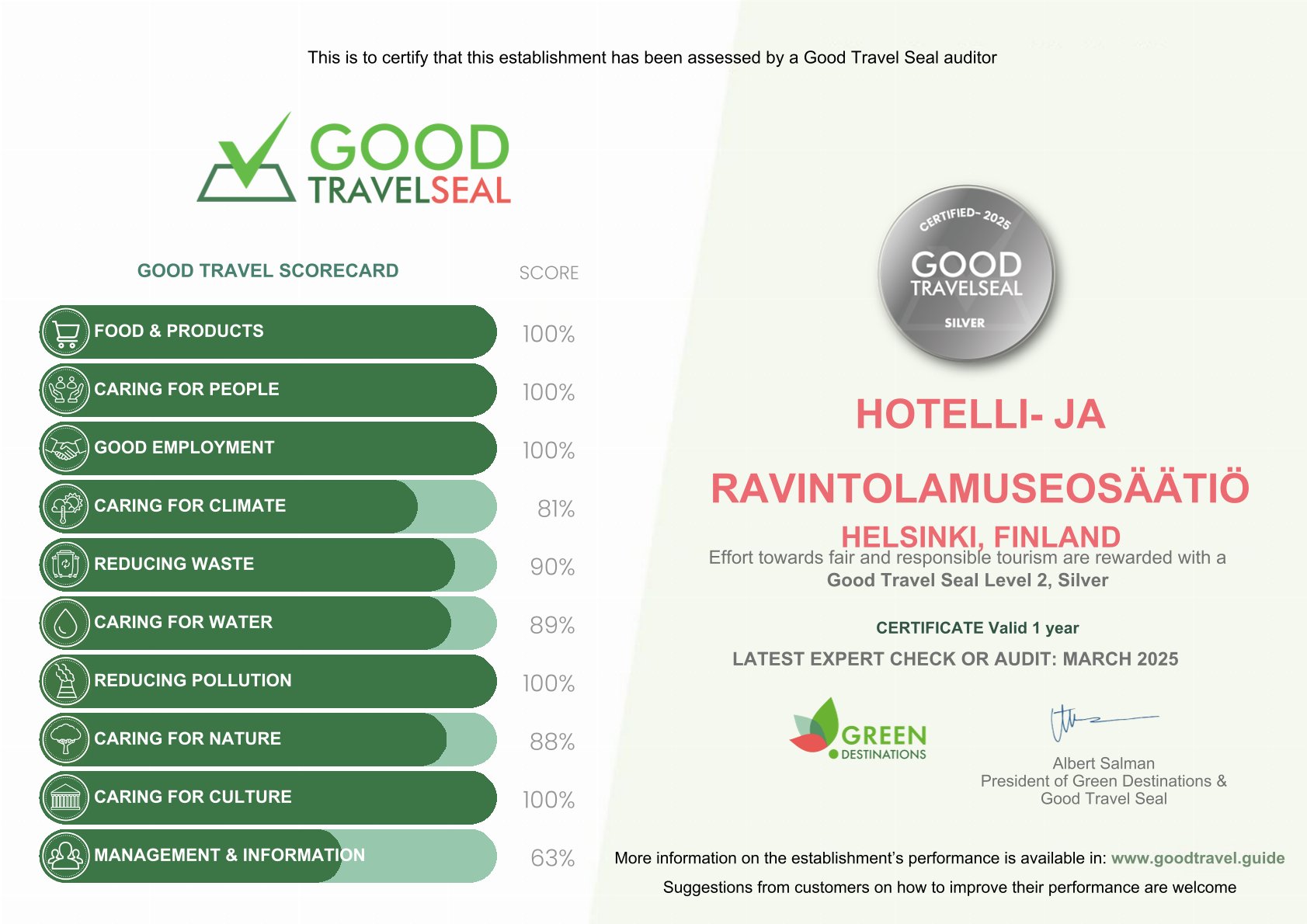 Hotelli- ja ravintolamuseolle on myönnetty kestävyyttä ja vastuullisuutta arvioiva Good Travel Seal -sertifikaatti. Sertifikaatin myötä olemme matkalla kohti Visit Finlandin Sustainable Travel Finland -merkkiä.