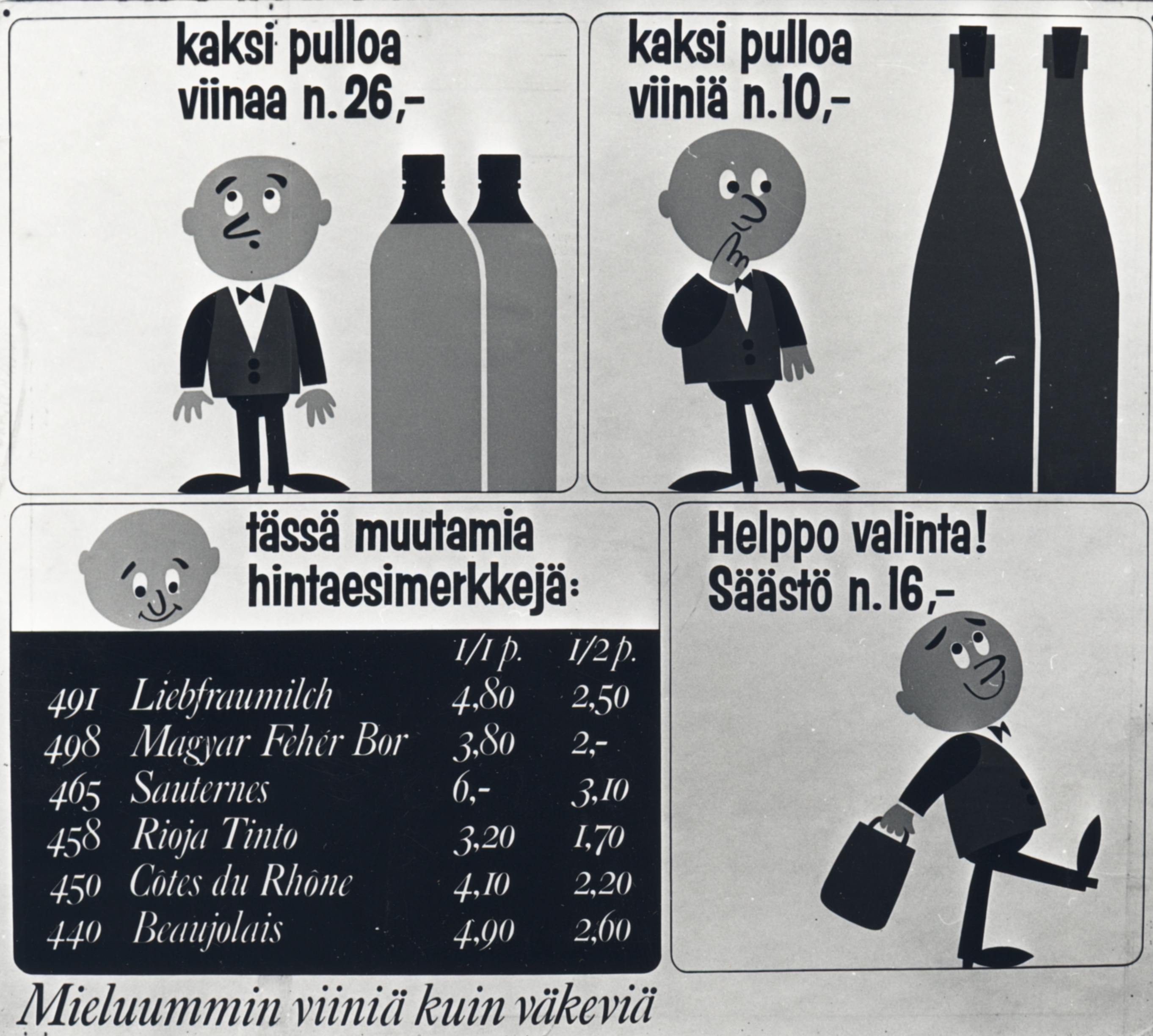 Kampanjan kruunasi iskulause “Mieluummin mietoja kuin väkeviä”. Tempaus lisäsi viinien tunnettuutta ja kantoi hedelmää kaksinkertaistamalla viinien kulutuksen 60-luvun alussa. Vuonna 1962 perustettiin ensimmäinen valintamyymälä, jossa viinit olivat suoraan asiakkaiden saatavissa ja valittavissa. Myymälöiden ulkoasun muutos oli aikalaisten silmissä ihmeellinen, sillä aikaisempi kontrollin maksimointiin pyrkinyt virastomainen tila muuttui yhtäkkiä ostoksiin houkuttelevaksi runsauden sarveksi pullotelineineen, esittelykoreineen ja värikkäine julisteineen. Lisäksi myyjät esittelivät tuotteita ja kannustivat viiniostoksiin.