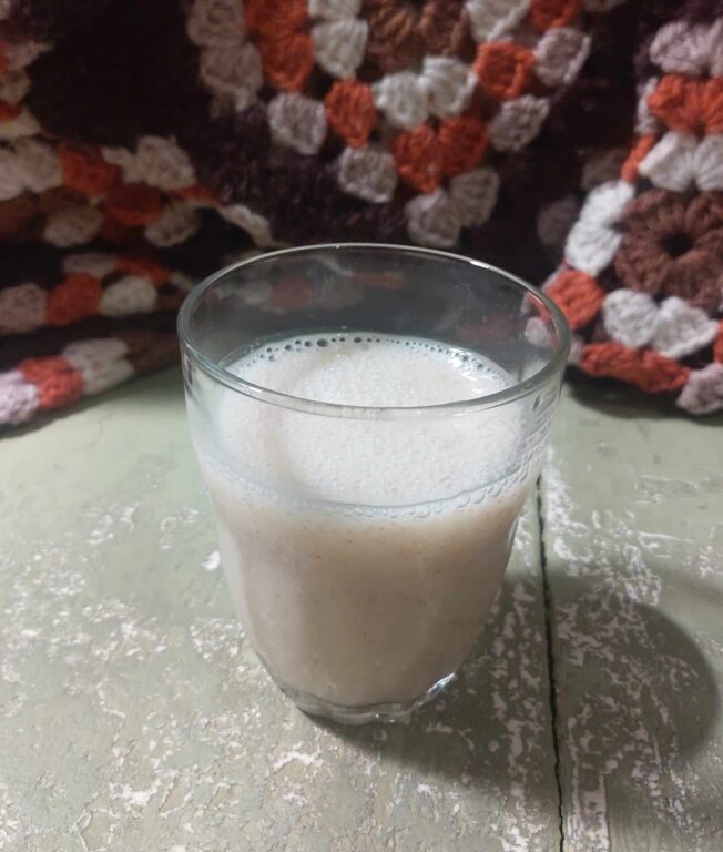 Juomalasissa on pellonpiimä-nimistä juomaa.