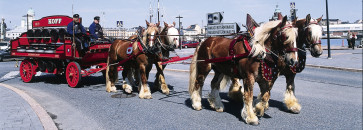 Sinebrychoffin nelivaljakko ja hevosmiehet Eero Lehtonen ja Markku Nyman ajavat pitkin Etelärantaa toukokuussa 2003. Kuva: Harri Vaskimo. Täydet oikeudet.
