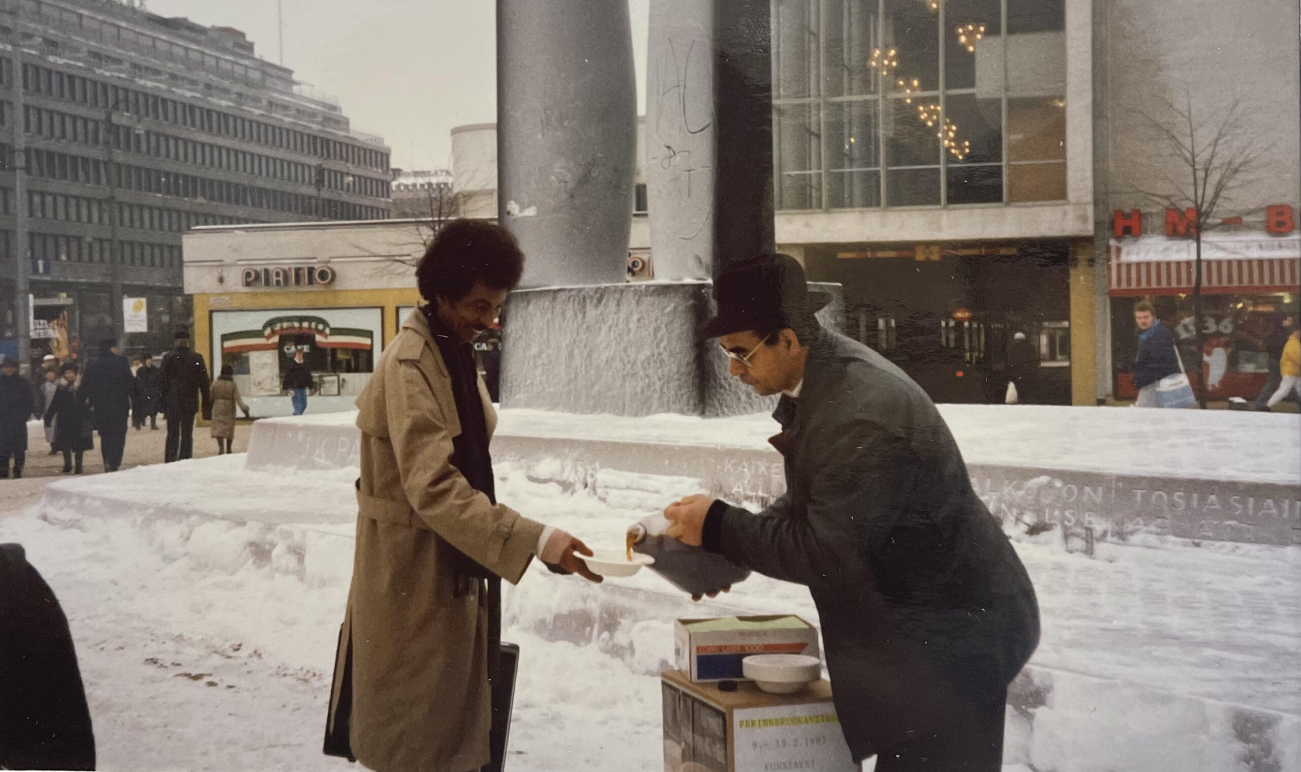 Kuva: Pitäjäruokaprojekti ja puolustusvoimat tarjosivat ohikulkijoille ruispuolukkapuuroa perinneruokaviikon (9.-15.2.1987) kunniaksi Paasikivenaukiolla Helsingin keskustassa. Eino Malkki jakamassa puuroa. Hotelli- ja ravintolamuseon kokoelmat.