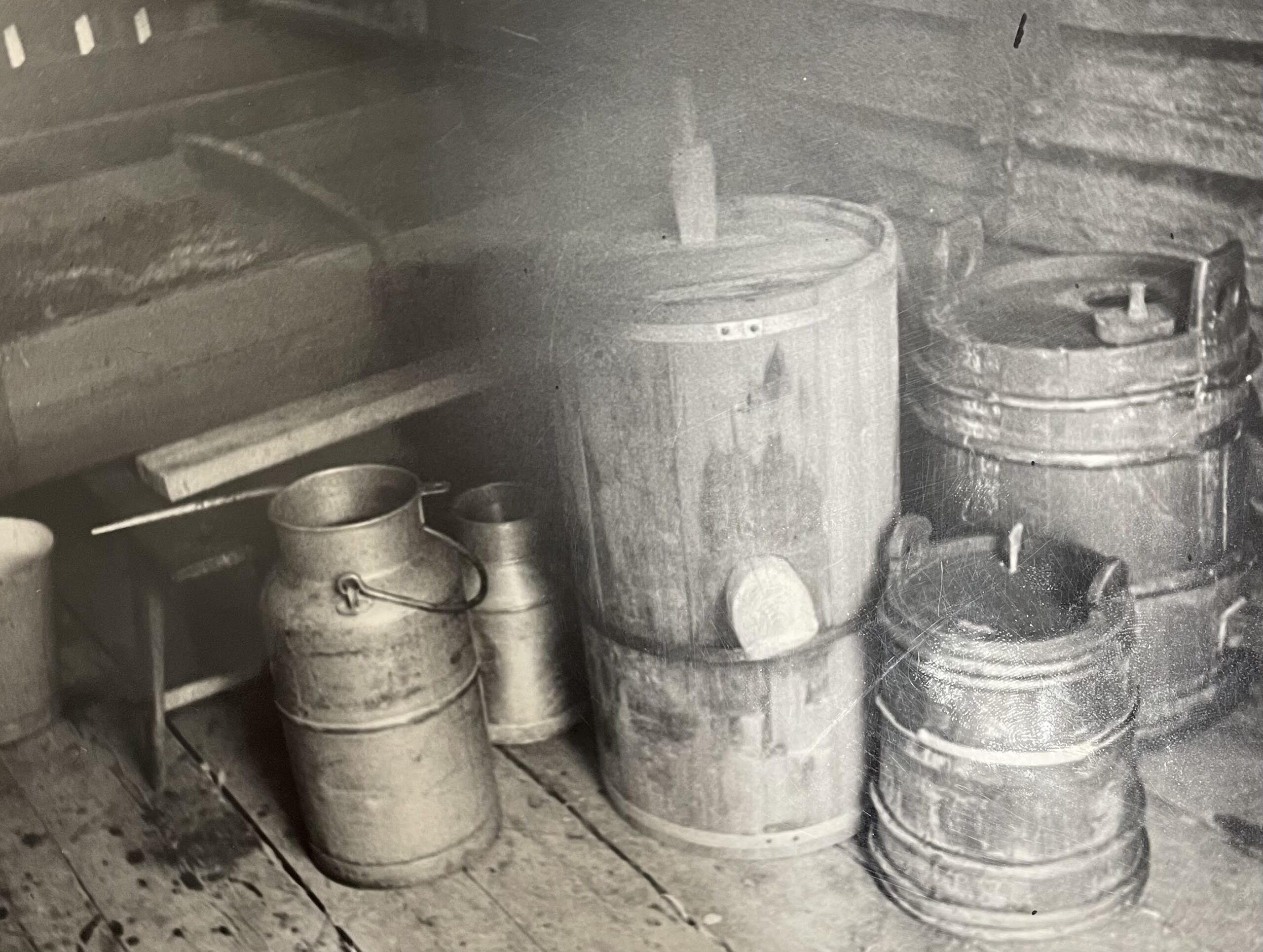 Kuva: Sahdin valmistusastioita 1930-luvulta: saavit, kuurnat ja tynnyrit. Satakuntalainen keittokirja (Suomalaisen Kirjallisuuden Seura, 1967). Hotelli- ja ravintolamuseon kokoelmat.