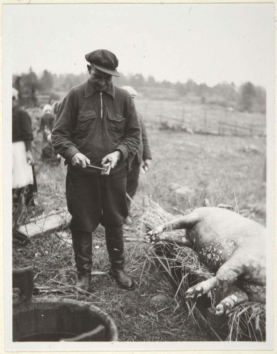 Sian ruhoa kaltataan, teurastaja Vihtori Pajula teroittaa puukkoa. Kuva: Auvo Hirsjärvi, 1938, Museovirasto, Kansatieteen kuvakokoelma.