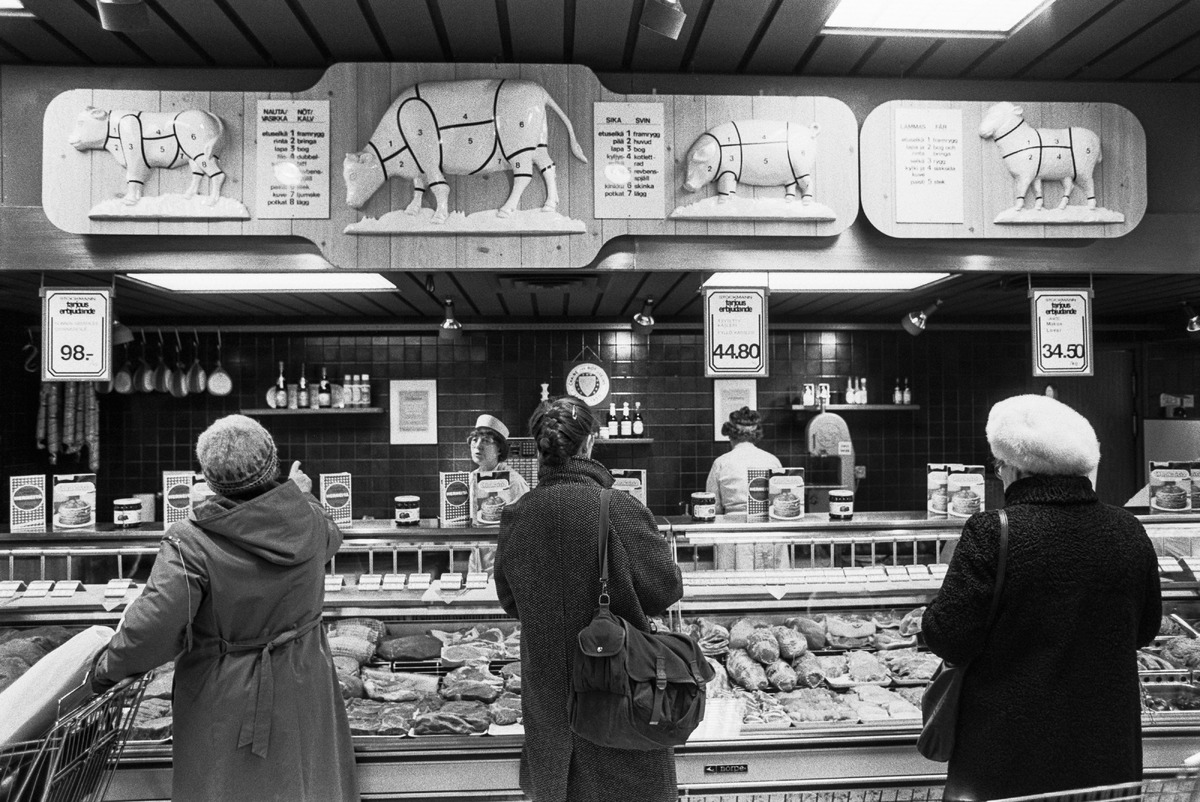 Asiakkaita Stockmannin tavaratalon lihatiskillä Helsingissä. Kuva: Kari Rainer Pulkkinen, 1986, Museovirasto, Kari Pulkkisen kokoelma.
