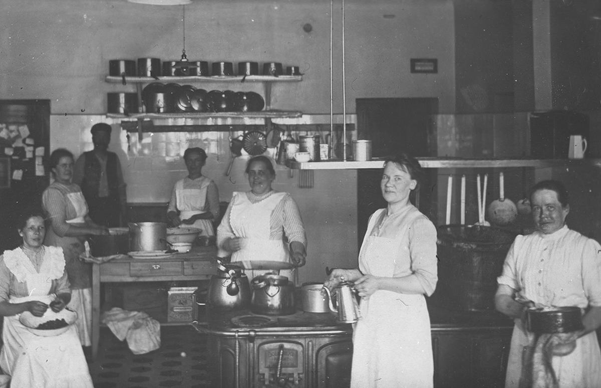 Parantolan keittiössä 1922 istuu vasemmalla vati sylissään Olga Matilda Silander os. Lehtinen, joka on Pietarissa käynyt keittäjätär. Hyvinkään kaupunginmuseon Aulis Saviahon kokoelma, CC BY-NC-ND 4.0.