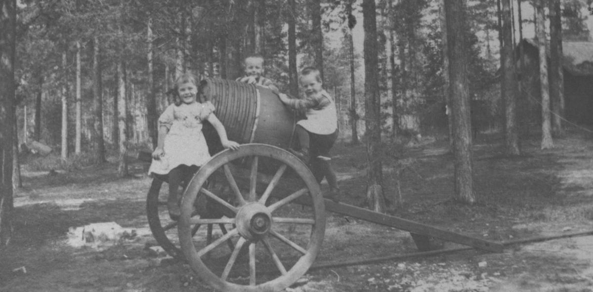 Parantolan vedenkuljetustynnyri. Kuvassa ylilääkäri Sandelinin lapset. Hyvinkään kaupunginmuseon Aulis Saviahon kokoelma, CC BY-NC-ND 4.0.